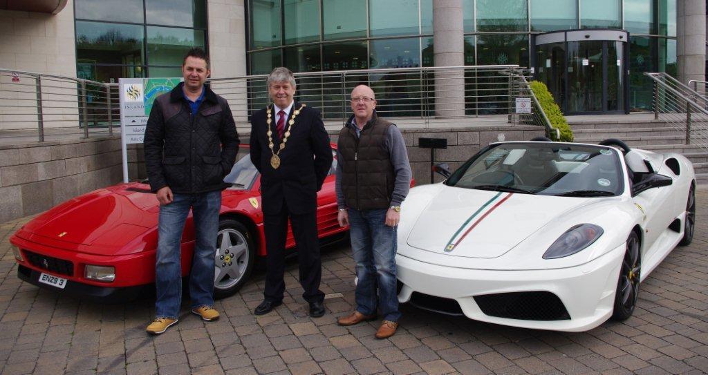 Mayor of Lisburn, Brian Heading pictured with Ferrari enthusiasts Paul Gray and Johnny McCall ahead of the Northern Ireland Italian Motor Club’s “All Italian Motor Event” at Lagan Valley Island on Saturday 26th May.