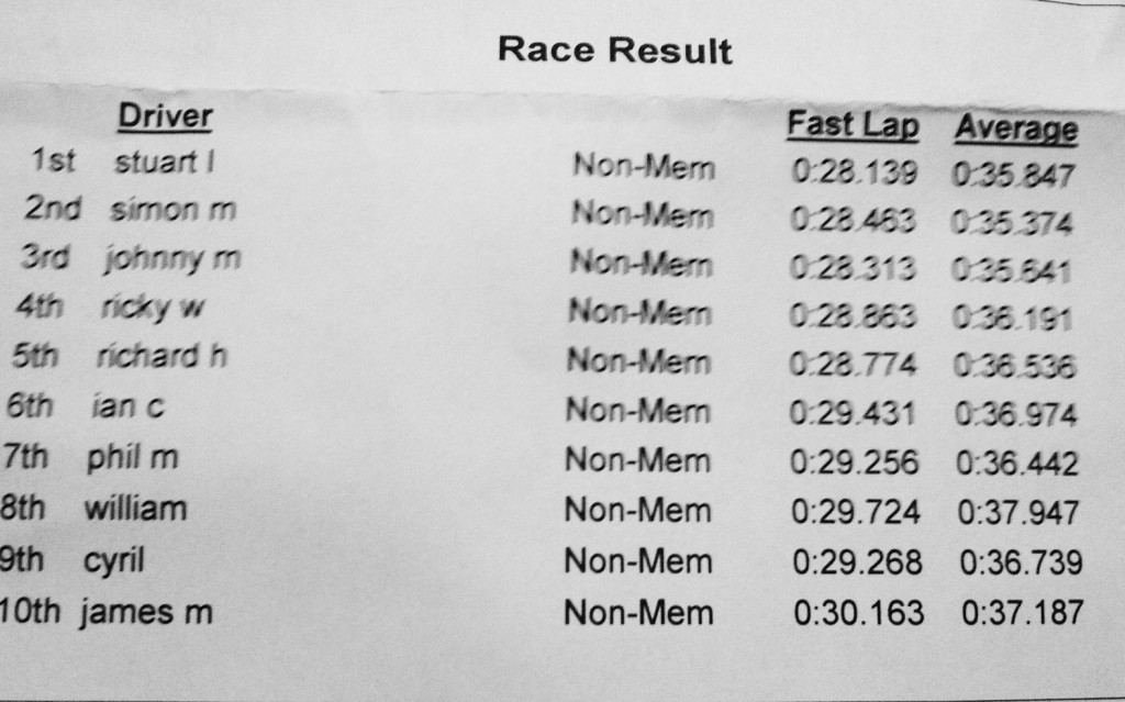 Ten members turned out, Stuart, Ricky, Simon, Johnny, Richard, Ian, Phil, Cyril, James and Paul so we decided to take the faster karts onto the track. After a practice session of 15 laps on the amazing outside track at Lyons, we then took a well deserved break for refreshments and to get the blood back to our arms!!!