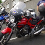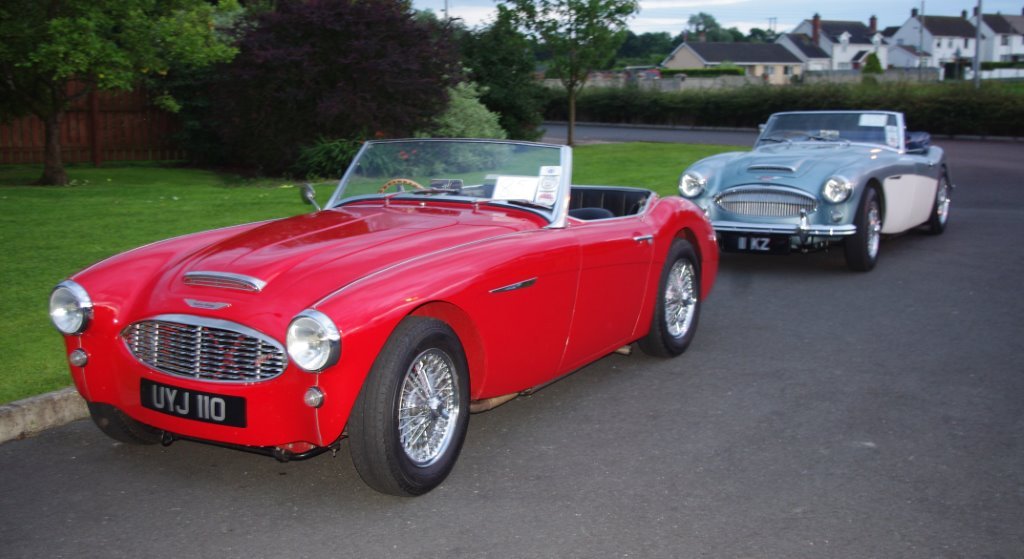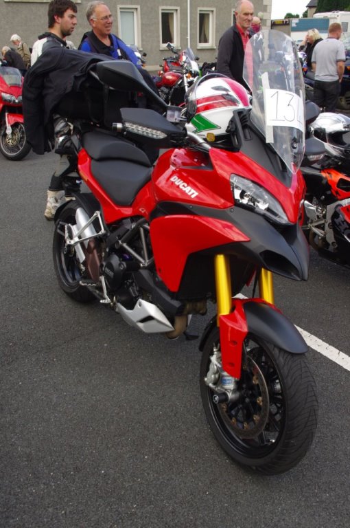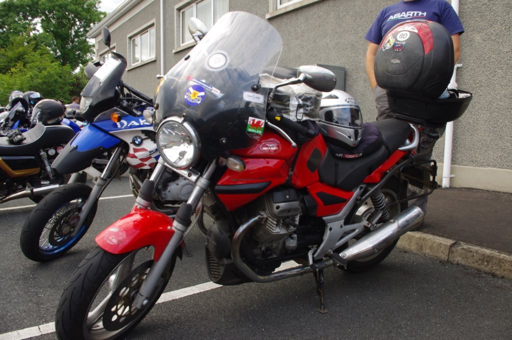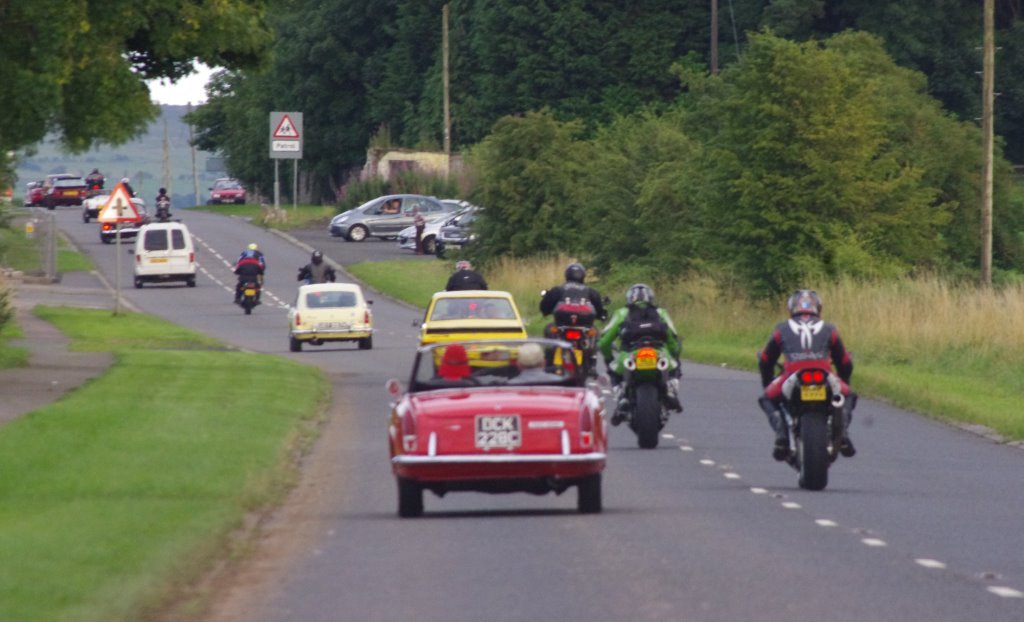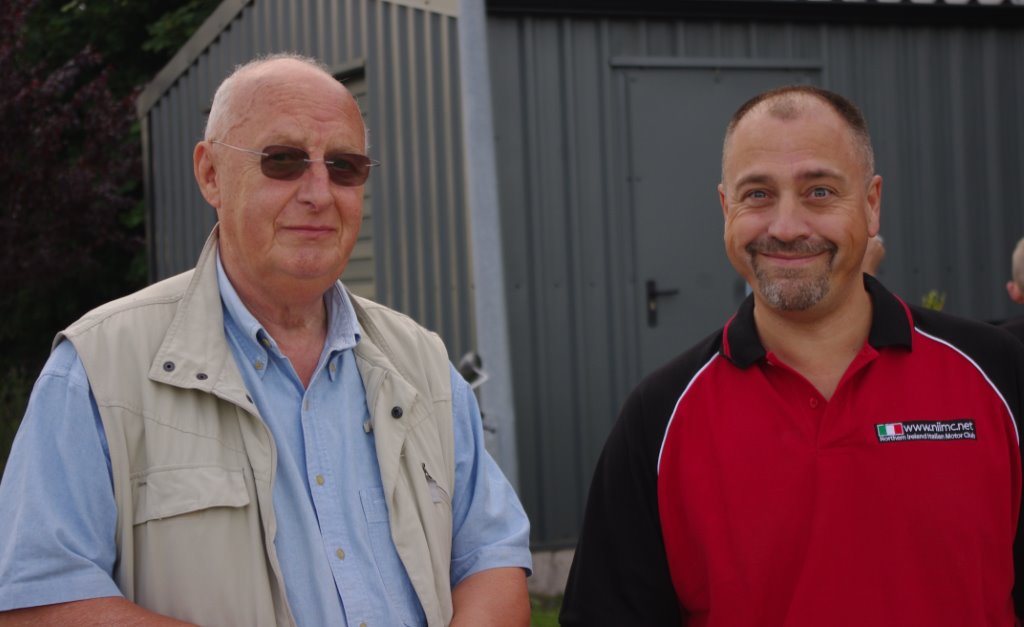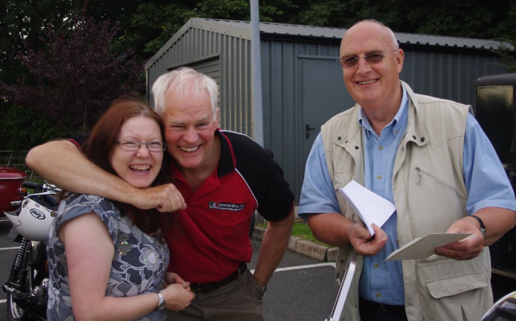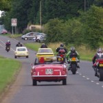 Once again this year’s Clady Vintage Run proved a hit with NIIMC members as they joined a range of motorbike and car enthusiasts who congregated at Killead Parish Church on the evening of Friday 16th August 2013. Ten club members turned up hoping that the weather would hold so that they could enjoy a dry trip round the old Clady circuit before returning to the church hall for some refreshments. Thankfully , despite some menacing clouds at times the rain did not appear so all the motorcyclists stayed dry and those driving cabriolets were able to “go topless”as the impressive throng of bikes and cars made its way round the circuit.