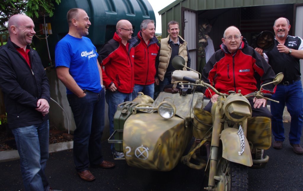 The visit wouldn’t be complete without a few photographs – Philip had raised the Italian flag on the flagpole in his garden and also showed us his 1968 BMW Sidecar Unit – quick as a flash Herbie jumped onto it and set up the perfect photo opportunity to round off a memorable visit (we didn’t know Herbie was so agile and with typical Herbie quip he reminded us that he’d never had any difficulty getting his leg over!!). As a token of our appreciation to Philip (and his wife who later joined us) we made a club donation to Philip’s chosen charity Cancer Research UK to support them in their continued research in all aspects of the disease.