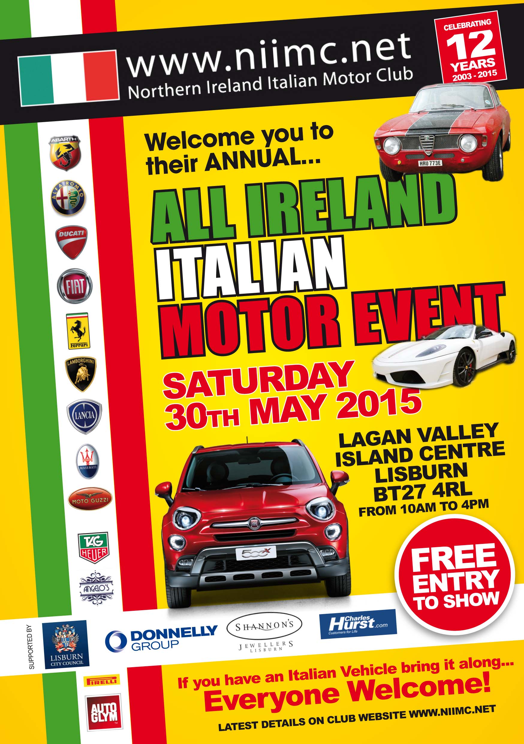 With less than 2 days to go we are counting down the hours until our annual All Ireland Italian Motor Event on Saturday. Interest levels in the show have been very encouraging and we hope that we will have an impressive selection of shiny cars and bikes for everyone to feast their eyes on. Donnelly Group will be bringing a selection of the latest cars from Abarth, Alfa Romeo and Fiat and the Abarth UK Area Manager, Peter Robinson (no, not that Peter Robinson!!) is making a special trip over in the latest special Abarth – a 695 Biposto. Charles Hurst Specialist Car Division will also be there with Italian style from Ferrari and Maserati and friends from the Alfa Romeo Owner’s Club, Southern Section will once again be making the trip from Dublin and further afield to join us. Their selection of cars always adds an extra dimension to the line up of cars on display.
