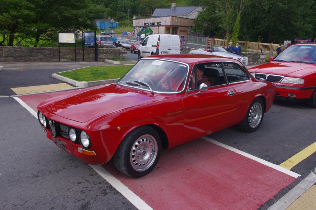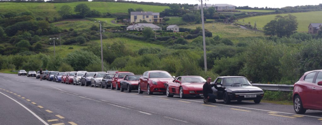 Those who weren’t content to travel at a modest pace disappeared up the road ahead of us, our suspicion being that as the beer in the hotel bar came highly recommended they were thirsty for a pint of unleaded. Meanwhile the rest of us headed through Enniskillen, Blacklion and on to Sligo. According to the itinerary those participating in the Targa Sligo were due to arrive at the local beauty spot, the Glencar waterfall at the same time that we were passing, so after a short detour we arrived at the carpark and waited for some Italian style to appear. Lo and behold within a few minutes they arrived, so apart from the wonderful natural scenery we were able to admire the impressive mix of Italian machinery, which included some rare models not often seen on our roads.