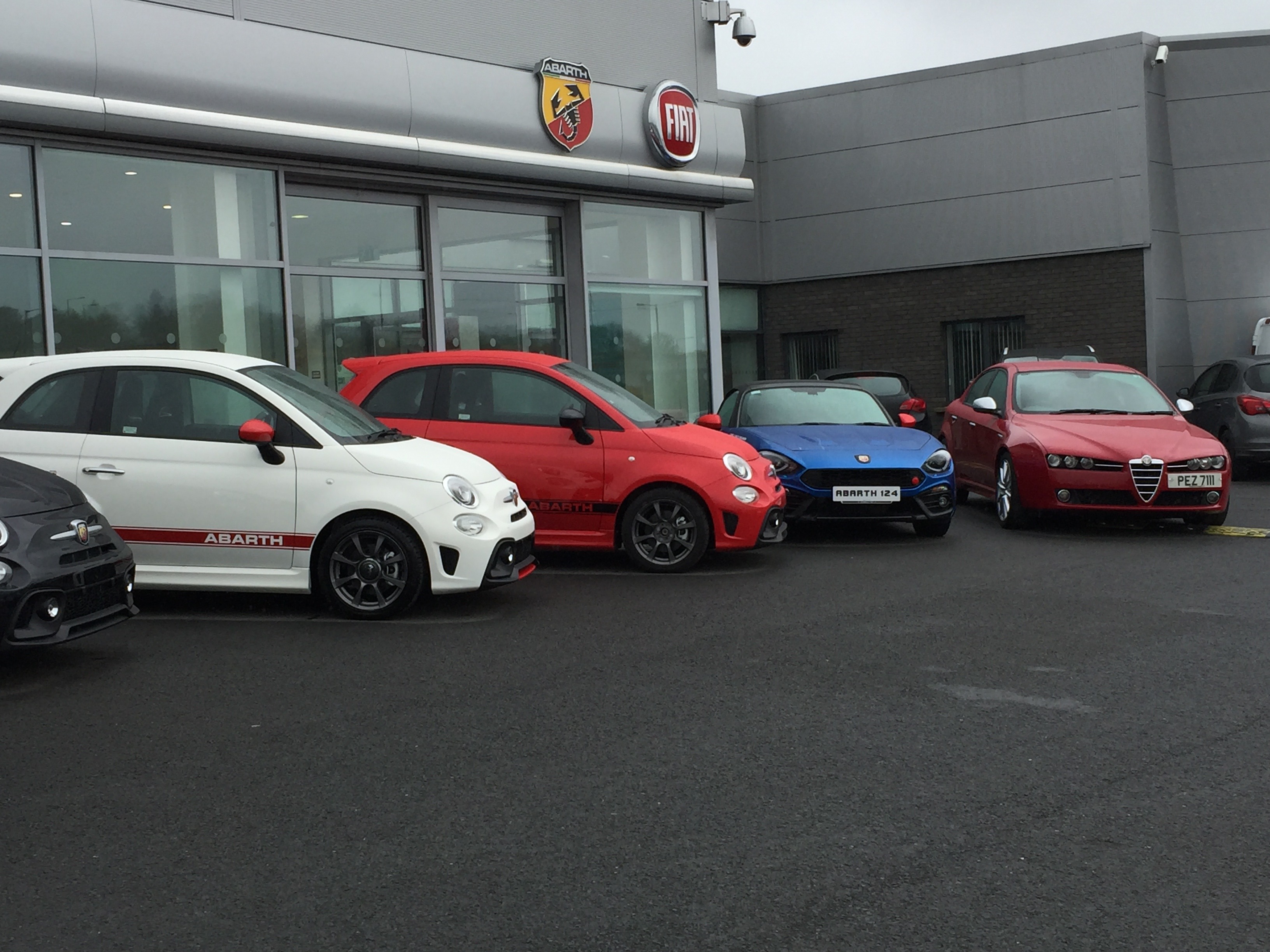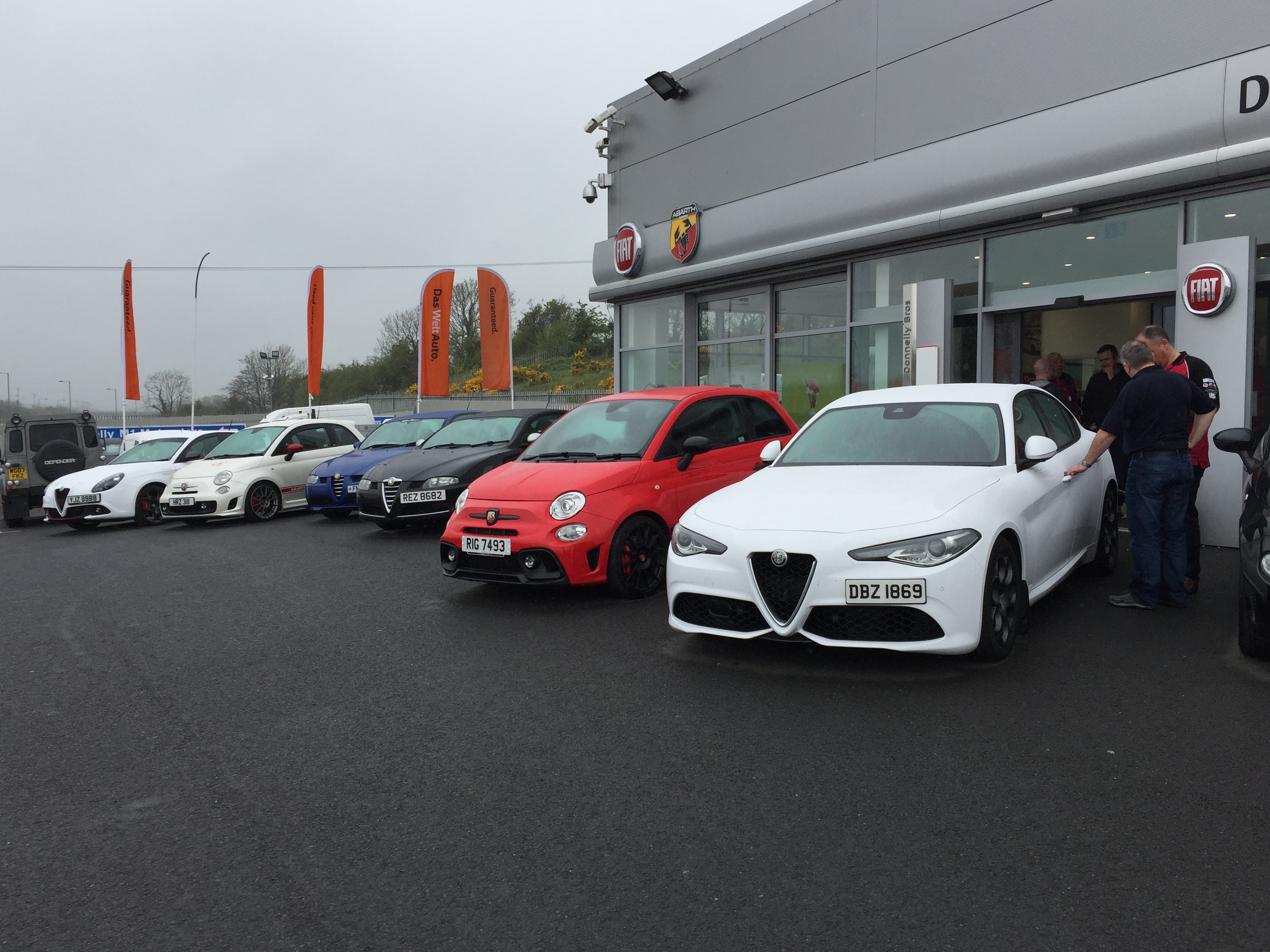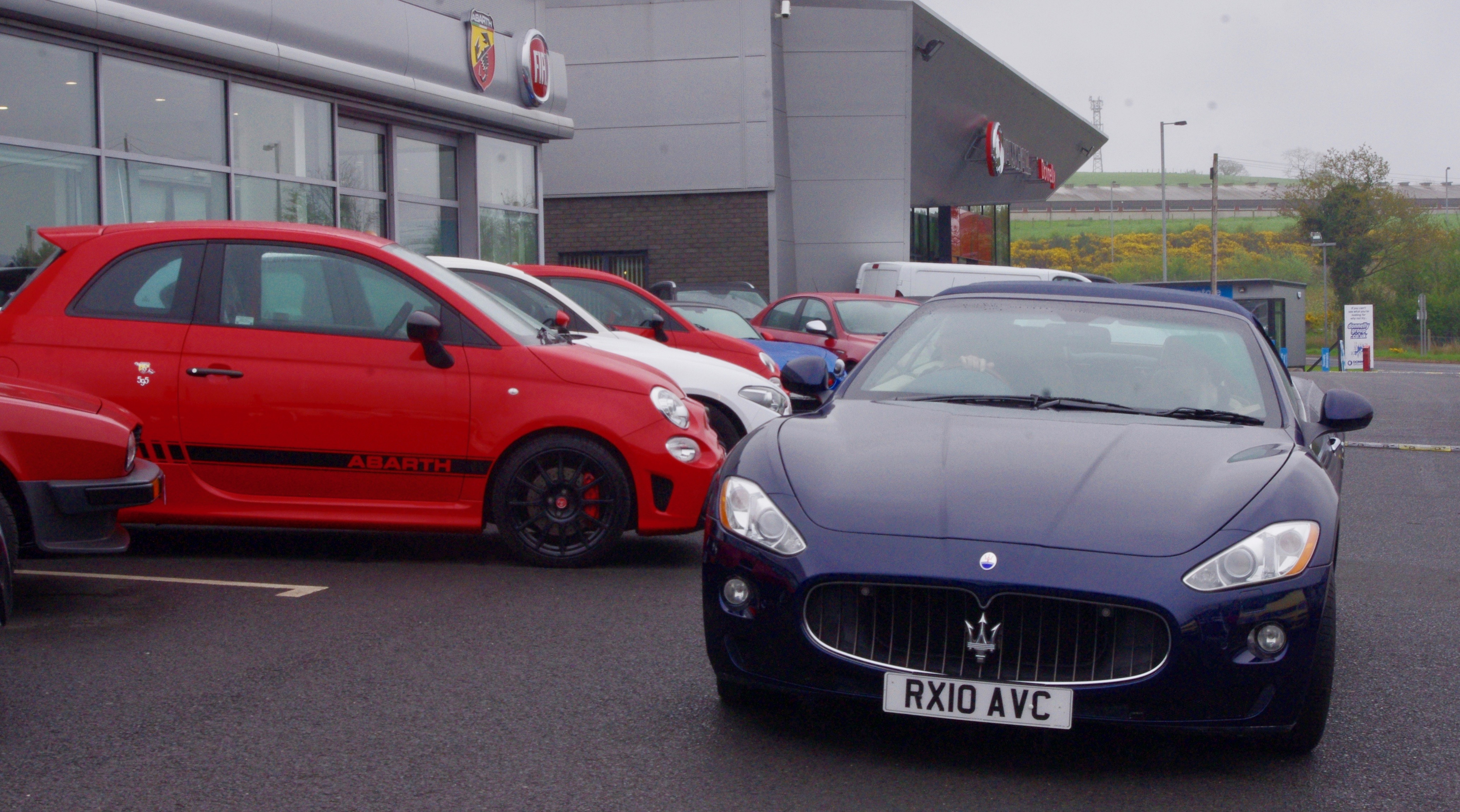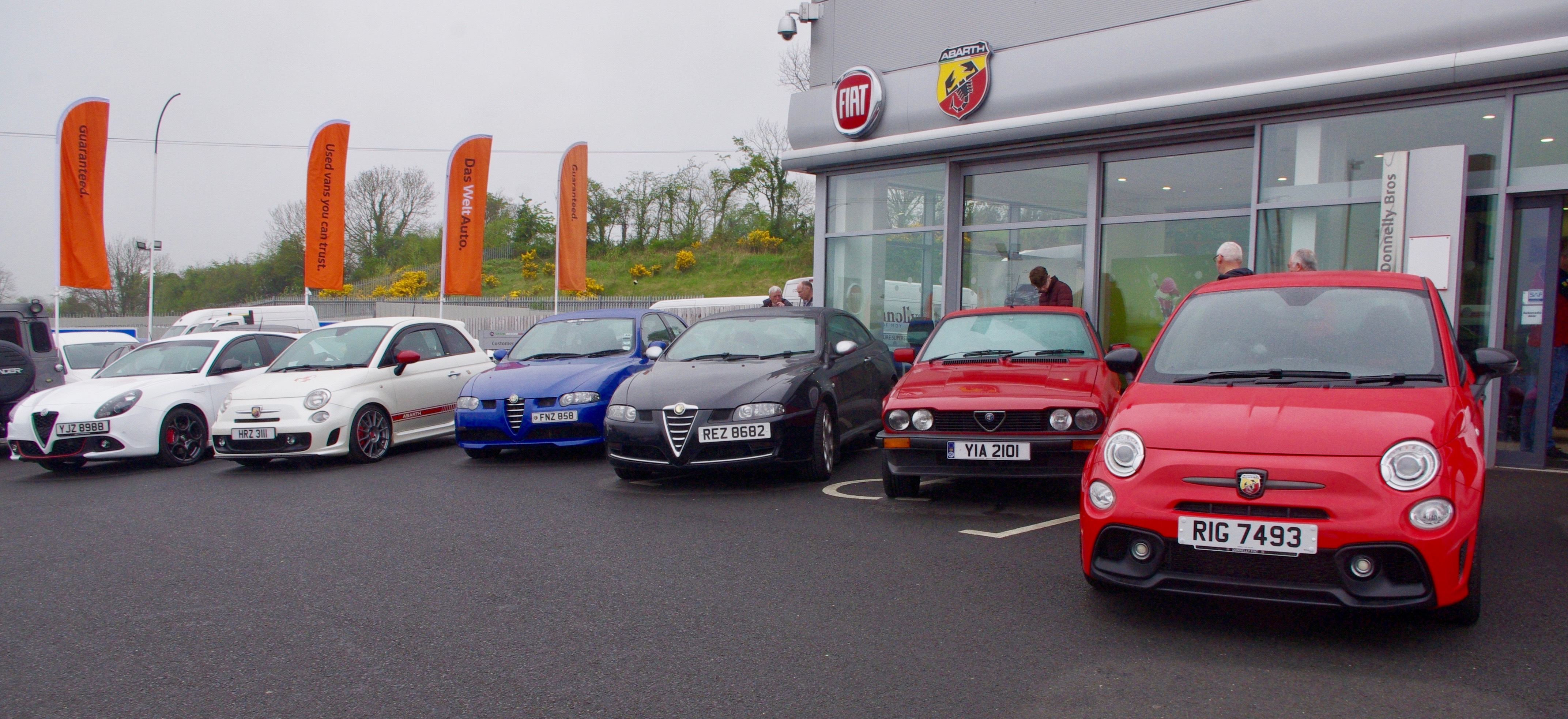 NIIMC members gathered in good numbers to show their support to Donnelly Group today as they celebrated the extension of their Abarth franchise to the Dungannon and Campsie sites. The starting point for the day was at McDonald’s at Sprucefield for the obligatory coffee stop. There was an impressive gathering of Italian metal in the carpark – 2 Maseratis, 6 Alfas, 3 Abarths a Fiat and a Lancia and by the time we arrived at the Dungannon showroom a further two Fiats and another Alfa had joined us.