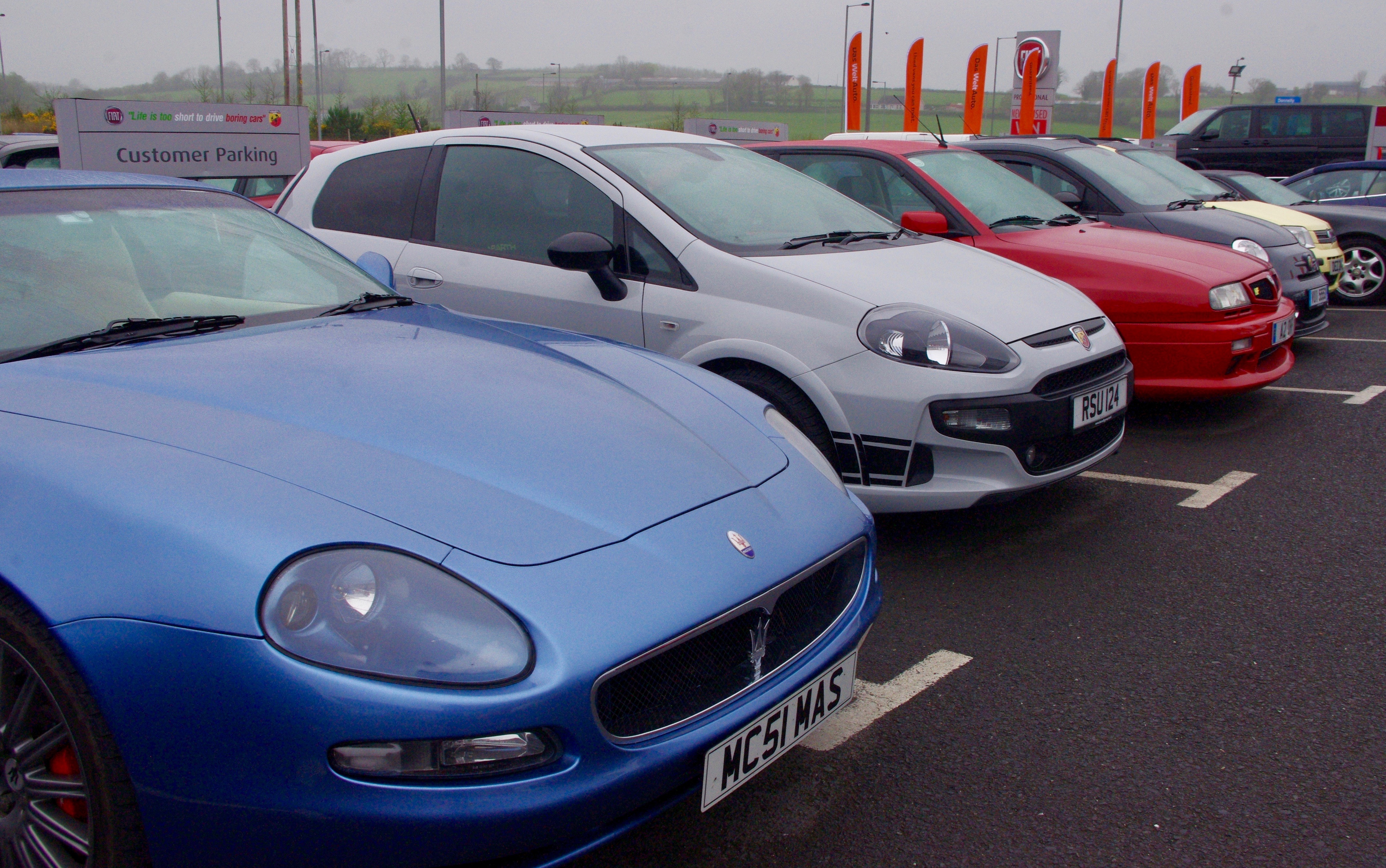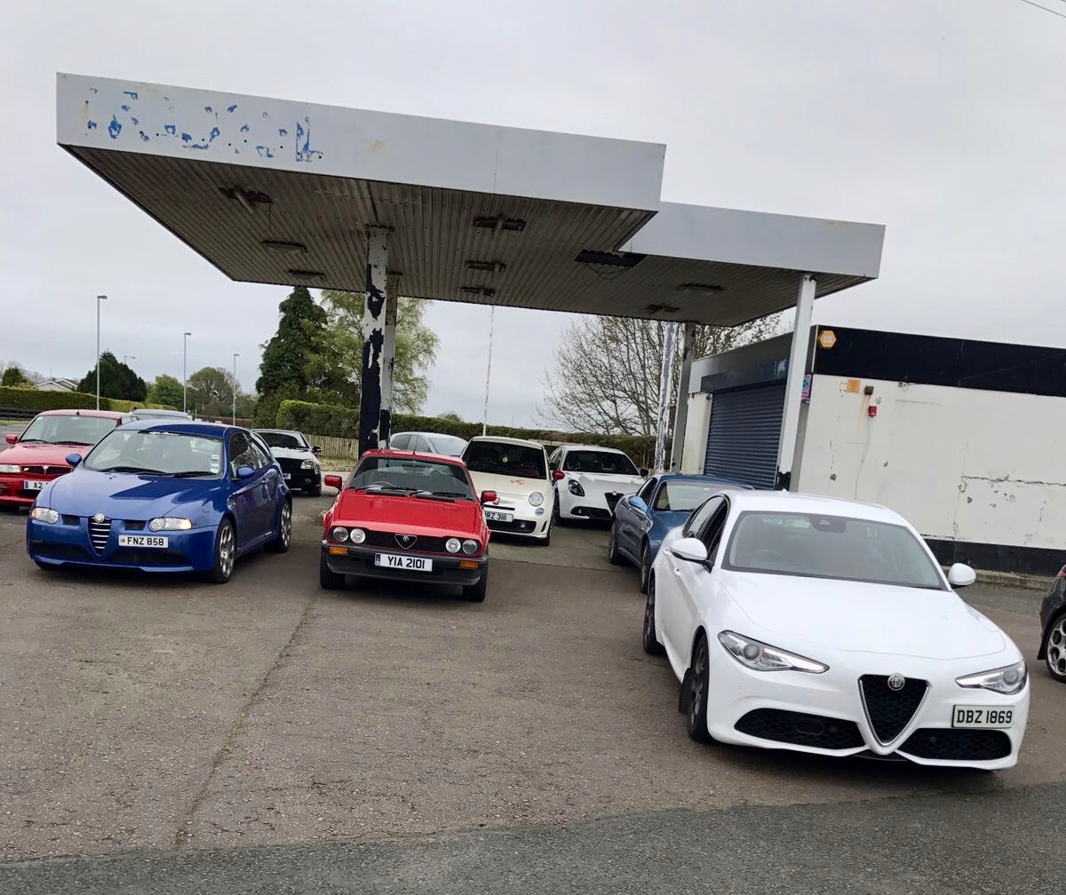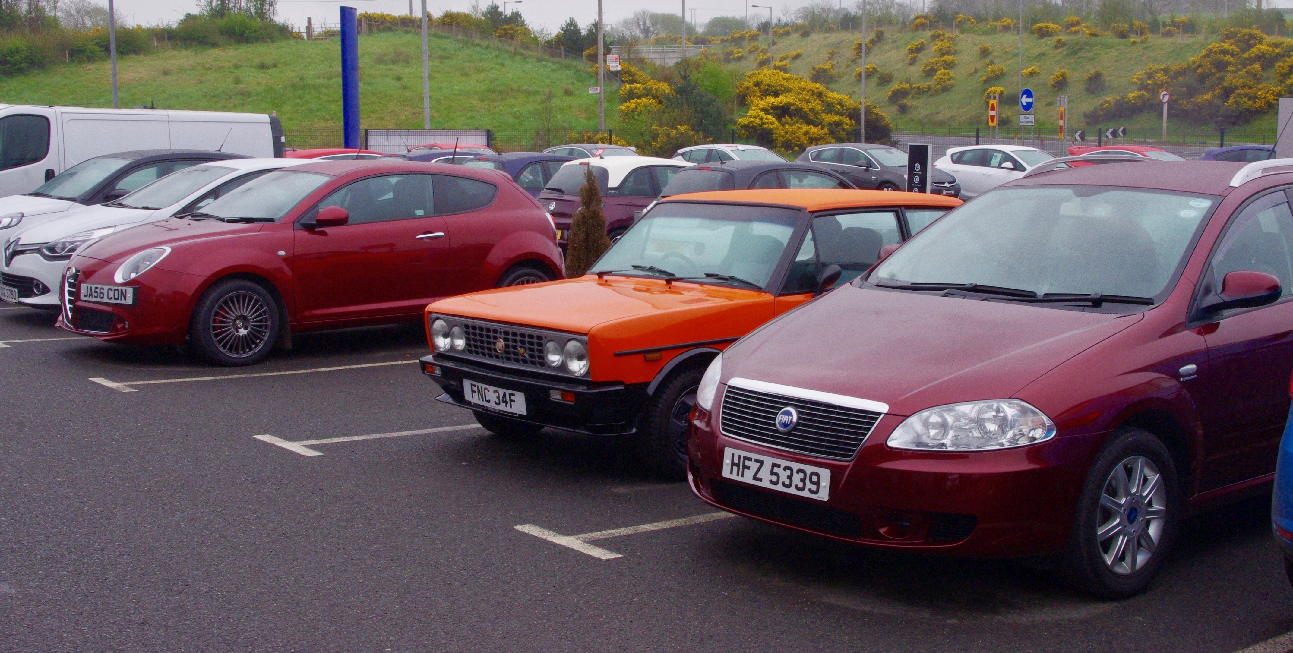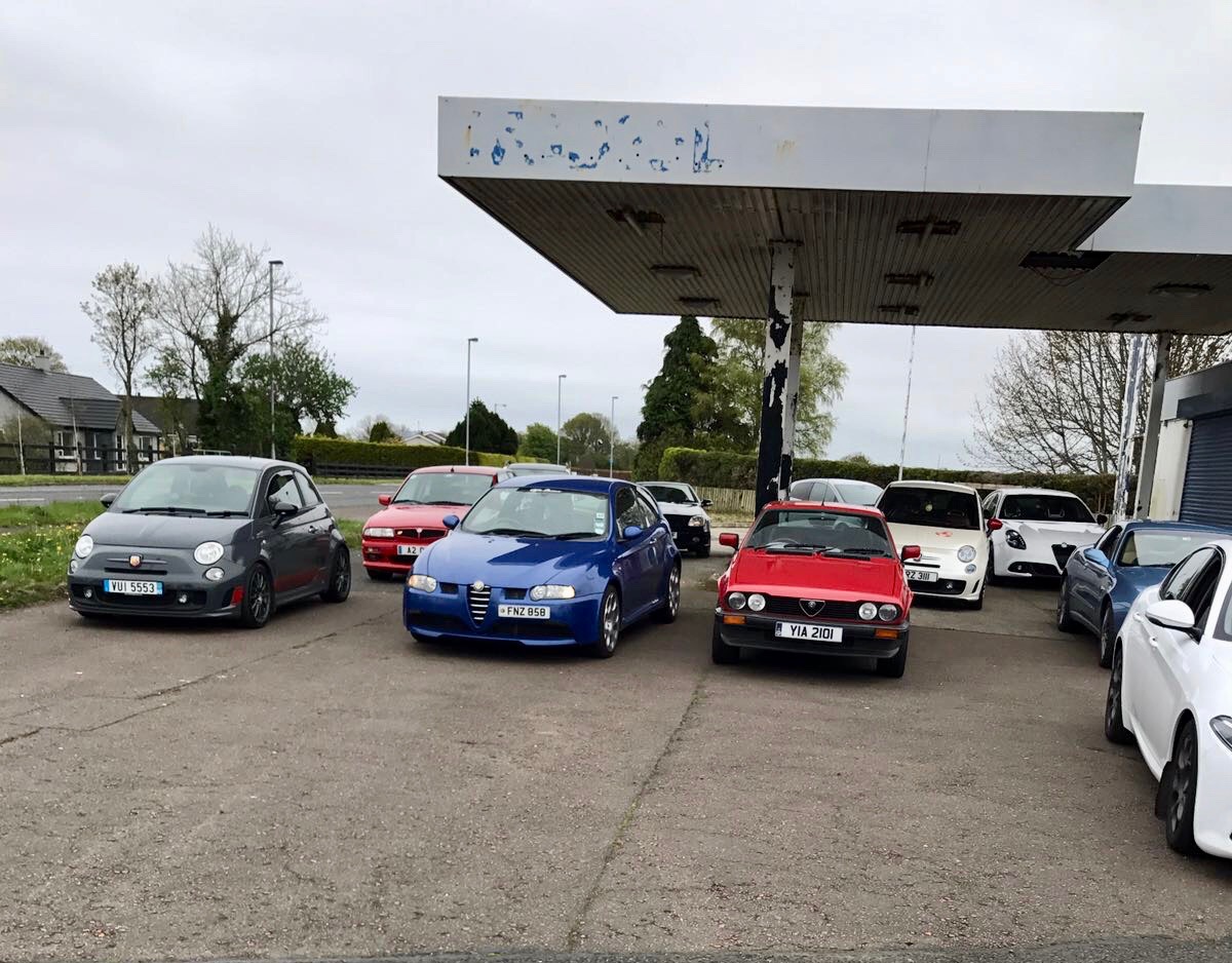 NIIMC members gathered in good numbers to show their support to Donnelly Group today as they celebrated the extension of their Abarth franchise to the Dungannon and Campsie sites. The starting point for the day was at McDonald’s at Sprucefield for the obligatory coffee stop. There was an impressive gathering of Italian metal in the carpark – 2 Maseratis, 6 Alfas, 3 Abarths a Fiat and a Lancia and by the time we arrived at the Dungannon showroom a further two Fiats and another Alfa had joined us.